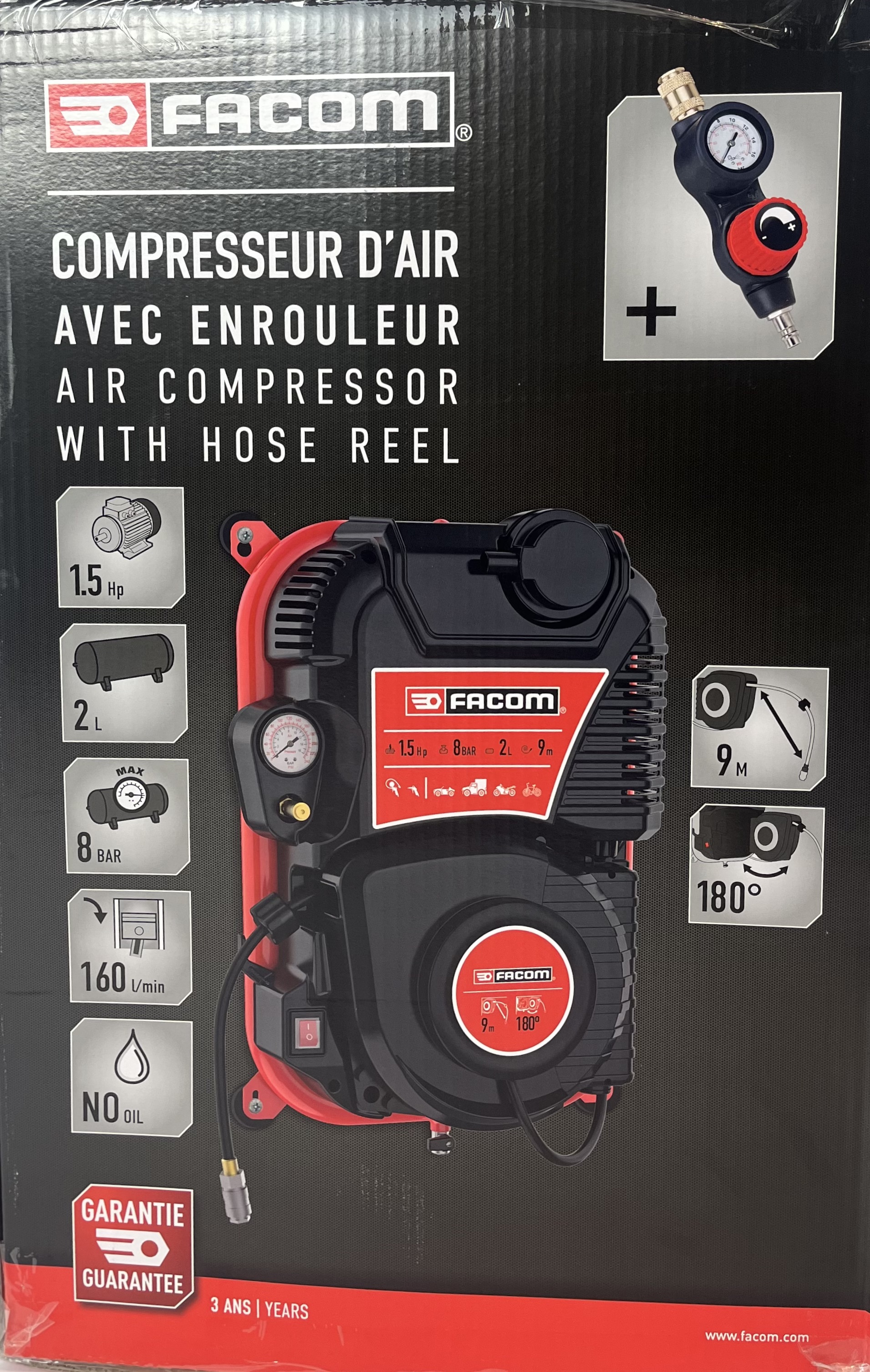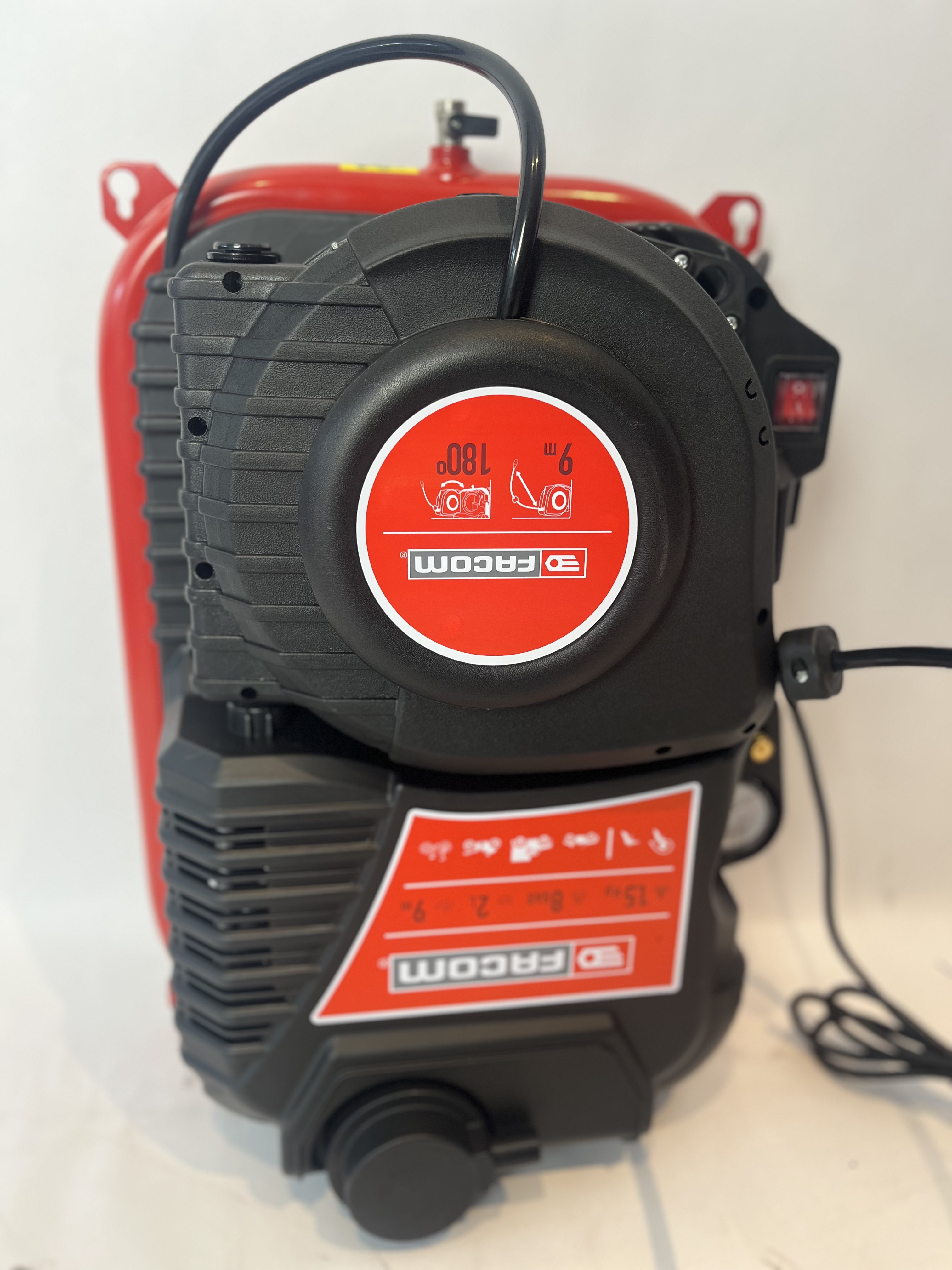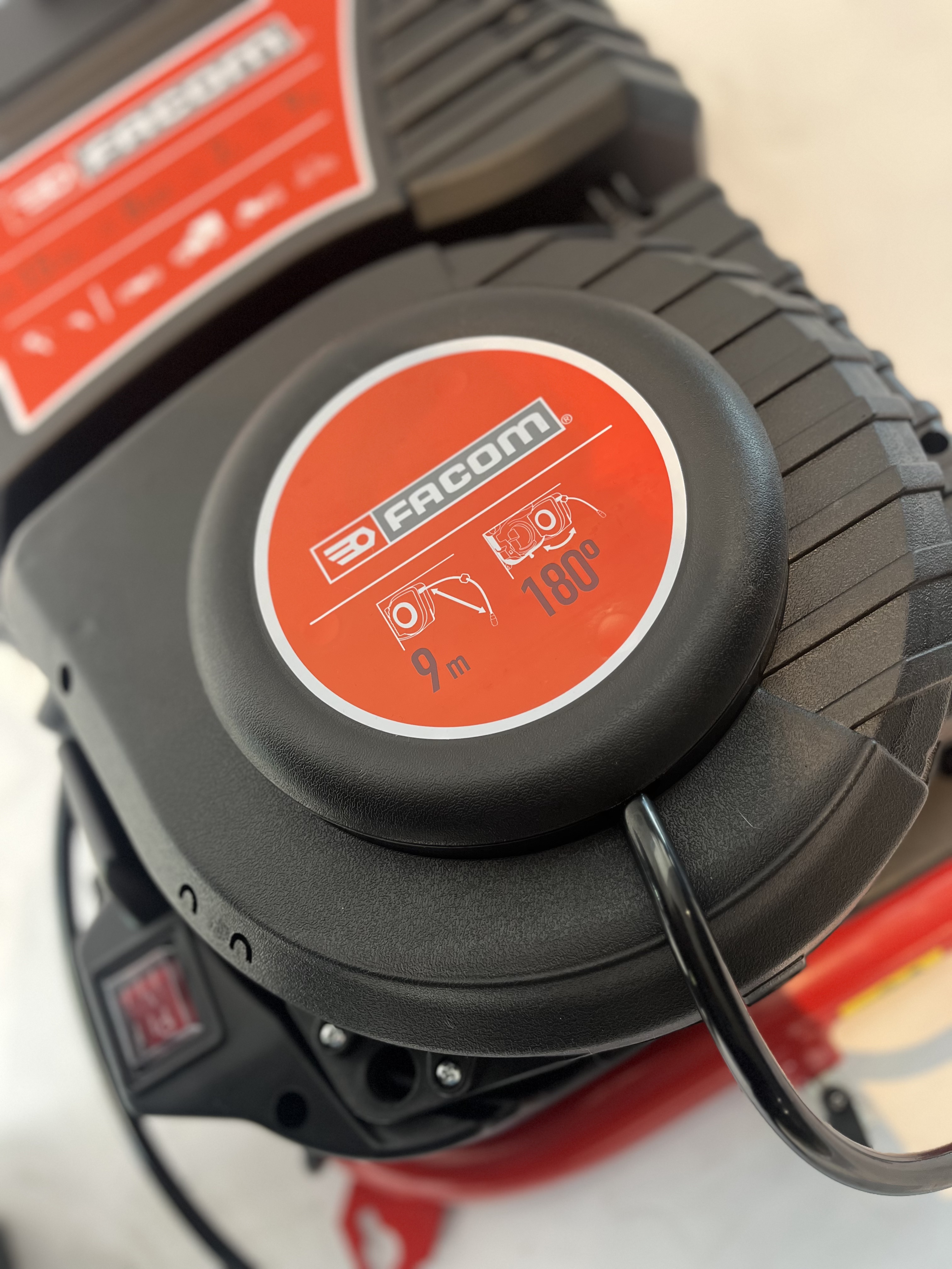 Deze Facom luchtcompressor met geïntegreerde haspel is de ideale oplossing voor wie kracht, mobiliteit en gebruiksgemak wil combineren. Dankzij het compacte design en de 9 meter lange automatisch oprollende slang heb je altijd perslucht binnen handbereik – zonder gedoe met losse slangen of grote tanks.